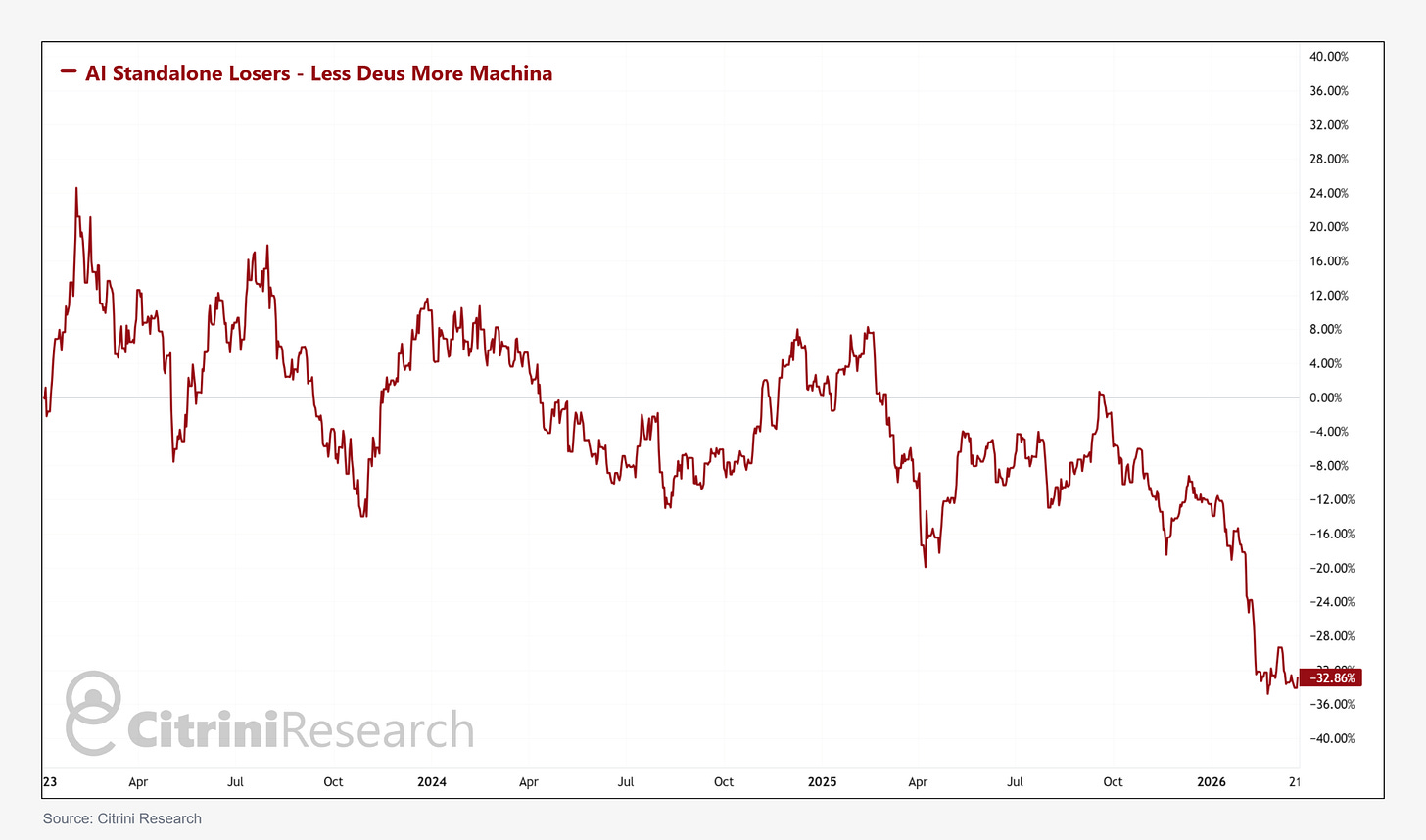 In our follow-up piece, Less Deus More Machina, we zeroed in on “AI Losers” – companies and industries most vulnerable to disruption with the proliferation of AI (and, importantly, agentic AI). Our “standalone short” basket of 26 losers worked fairly well against a rising market for the following two years, albeit with a good deal of choppiness along the way. But, the waterfall really began late last year – just as the “agents” arrived.