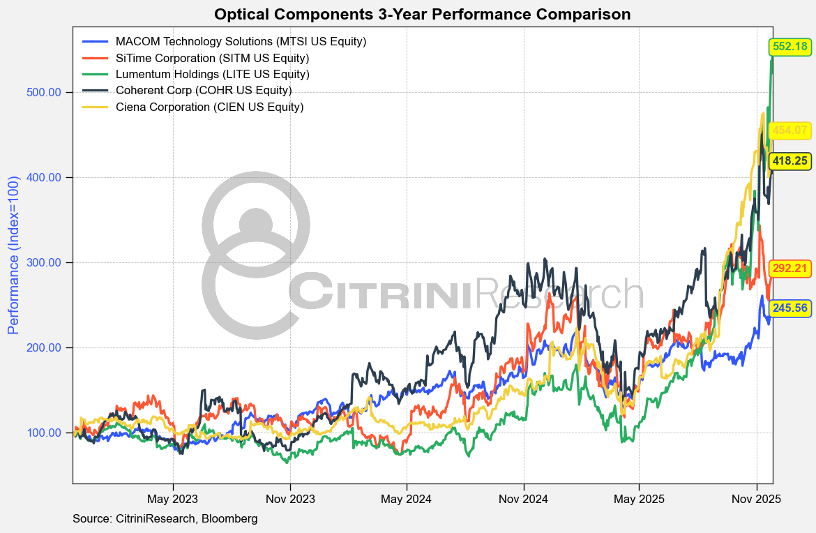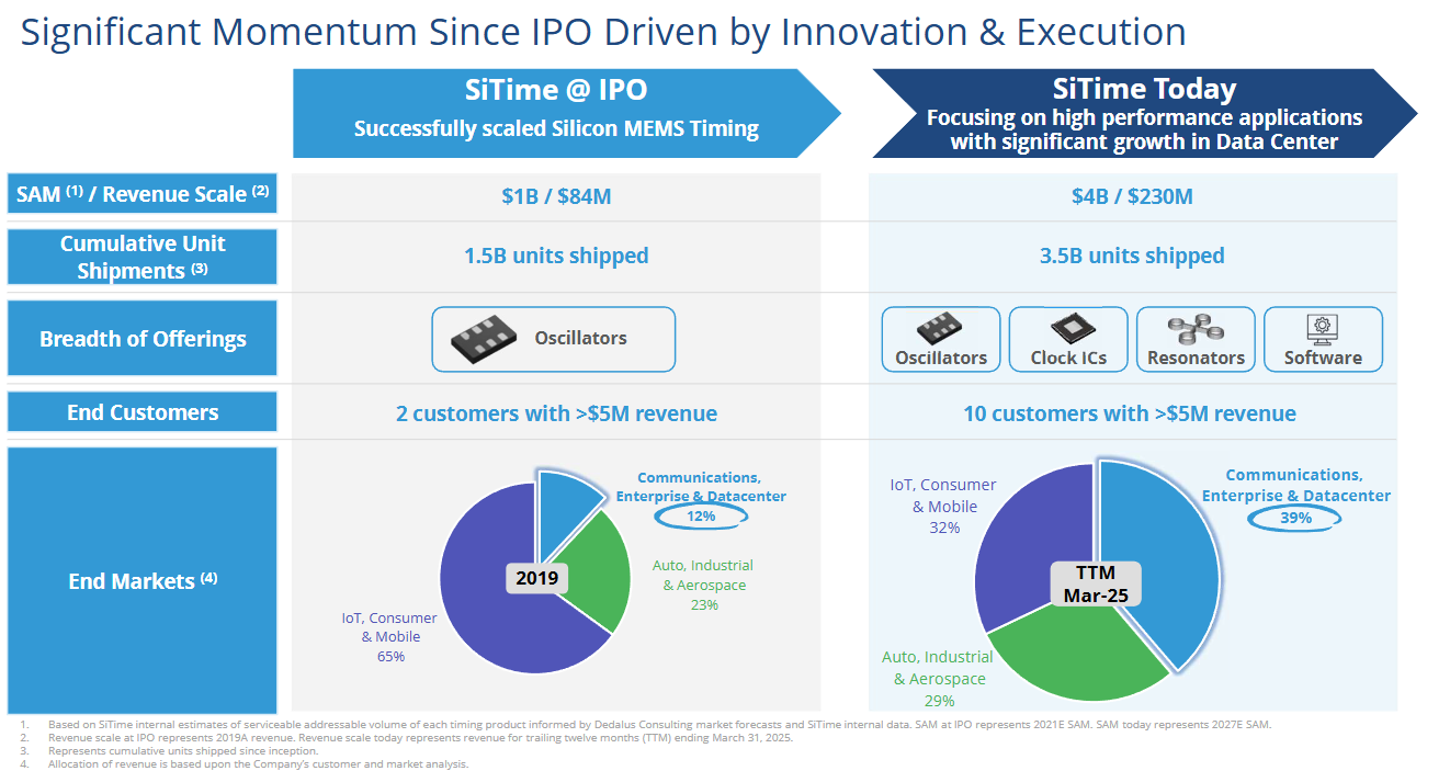 Since the AI trade kicked off in earnest, SiTime has lagged in performance relative to Coherent, Lumentum, and Ciena due to their exposure to IoT and mobile.