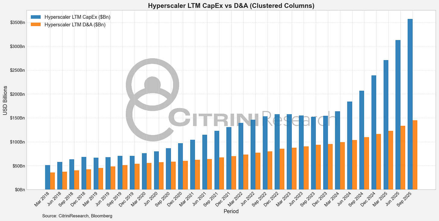 Further, the sheer pace of capex acceleration does mechanically result in an overstatement of earnings relative to cash flow. Usually we can ignore these sort of accounting discrepancies as rounding errors, but over the past twelve months the gap between hyperscaler capex and D&A has exploded to over $200 billion – a material portion of the entire market’s earnings.