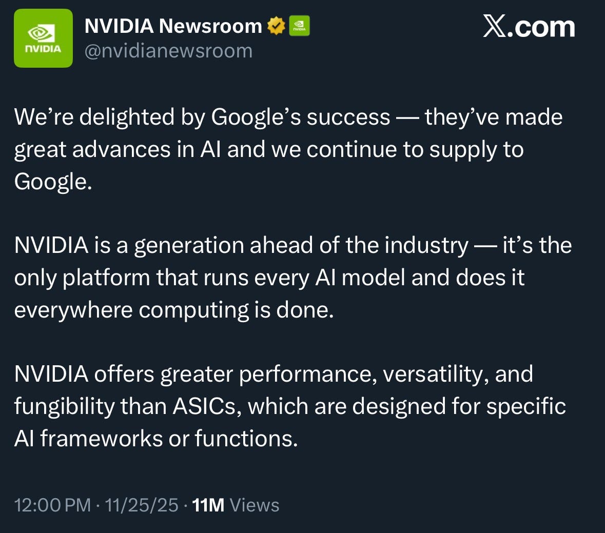 Switching costs for architecture/ecosystem is high for AI accelerators. Gemini 3 should be bullish for compute demand as labs locked into NVDA rush to buy more of the next gen chips to compete.