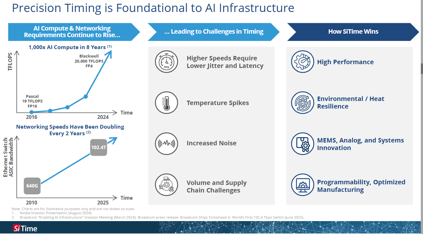 “For example, optical module bandwidth is doubling to the 1.6 terabit level and these new modules are beginning to ramp now. Demand for the 1.6 terabit modules has recently doubled, indicating a sharp transition to 1.6 terabit technology in first-half 2026. Additionally, SiTime’s oscillator ASPs in this application are higher because of the higher frequency and performance requirements.”