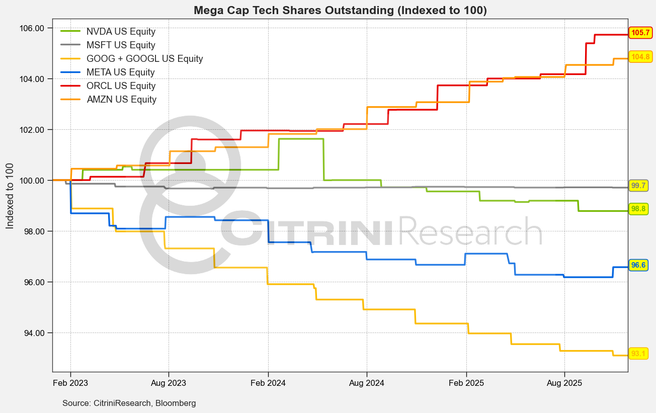 To the extent that these companies have a low cost of capital and believe in the ROI of AI capex, they will be less focused on returning shareholder capital. AMZN and ORCL shares outstanding have climbed, while MSFT is maintaining buybacks at a level that’s just enough to offset stock-based compensation.