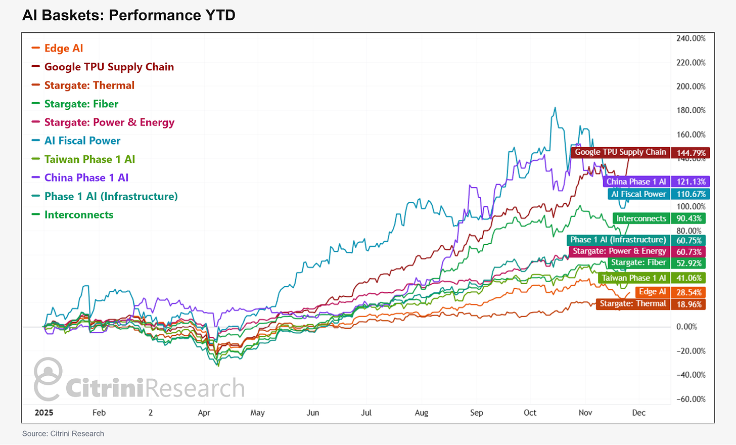 Across the various AI categories we track with our baskets, these direct TPU suppliers have been the best performing group YTD with the majority of that outperformance beginning around August: