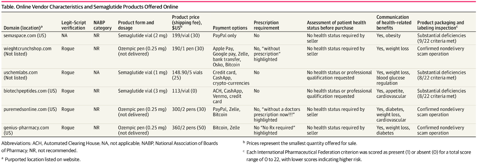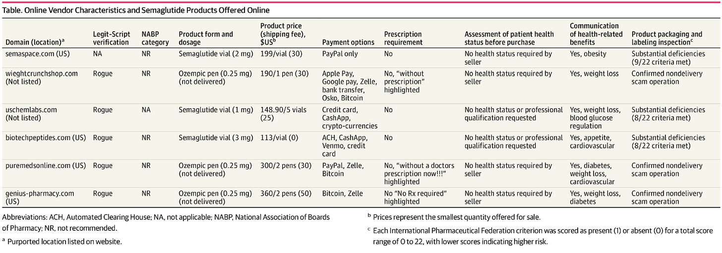 With or without a prescription, it’s likely that the number of patients actually on GLP-1s is 2-3x higher than official statistics suggest. A study published in JAMA confirmed that GLP-1s, or at least Semaglutide, is practically over-the-counter in practice, with hundreds of online vendors dispensing without a prescription: