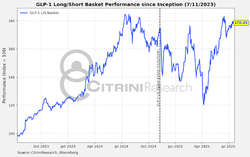This concern, combined with the risk of patent cliff and compounded pharmaceuticals/grey market peptides on GLP-1 manufacturer economics, caused us to exit the basket in November 2024. We realized a 75% gain over the span of 14 months, and promised to continue monitoring what we believe is a generational inflection.