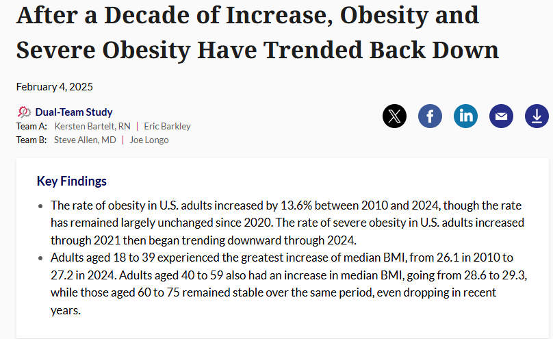 Two years ago, CitriniResearch’s third-ever thematic primer “Upgrading from Overweight” made a host of bold claims about the new class of weight loss drugs, GLP-1s. First, that GLP-1s represent a breakthrough addressing one of the largest health crises in history - the obesity epidemic. We argued that GLP-1s would become ubiquitous, following a trajectory similar to Lipitor or Viagra. Widespread adoption, in turn, would lead to the first “downtick” in the U.S. obesity rate for the past four decades. That has begun: