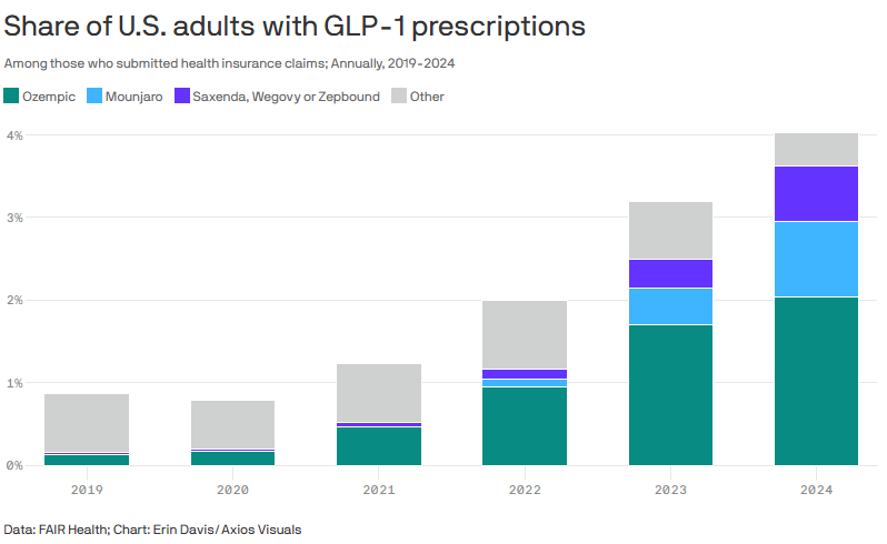 Now, the thing about second-order effects is that the first-order has to play out to some critical degree. Based on prescription numbers, it is clear that more and more people are using these drugs. At the end of 2024, nearly 4% of U.S. adults had a prescription for GLP-1 drugs.