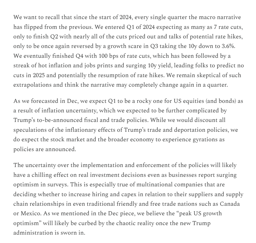 Since our last monthly macro memo, events have panned out mostly as we predicted. We argued that the US economy had hit peak growth optimism that was likely to wear off once the excitement over the Trump 2nd term subsides. We also predicted that we’d continue to see further disinflation as shelter disinflation continues to feed into CPI and PCE indices.