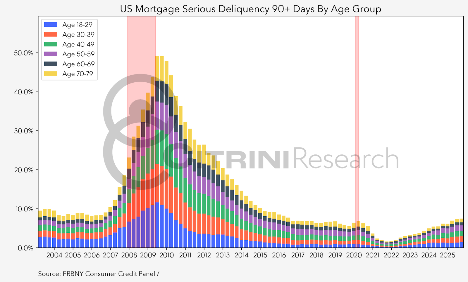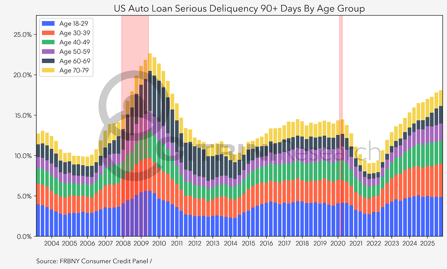 Delinquency rates among consumer borrowers remain concerningly high, and may move higher. This is among the best demonstrations of the K-shaped economy. Auto loans in particular stand out as one of the poorest performing categories of consumer credit, with metrics continuing to deteriorate.