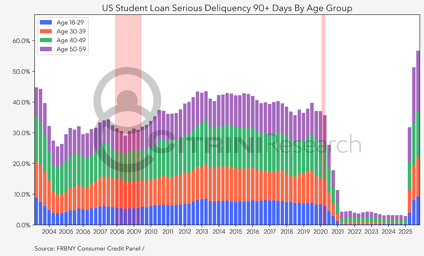 By contrast, mortgage delinquencies are not high by historical standards, reflecting the fact that American households, especially the older and richer ones, have generally de-levered and accumulated significantly home equity over the past decade. Yet even here, it’s unmistakable that delinquency rates are rising. Student loan delinquencies have surged too as the COVID moratorium has ended, and non-paying accounts are again recognized accordingly.
