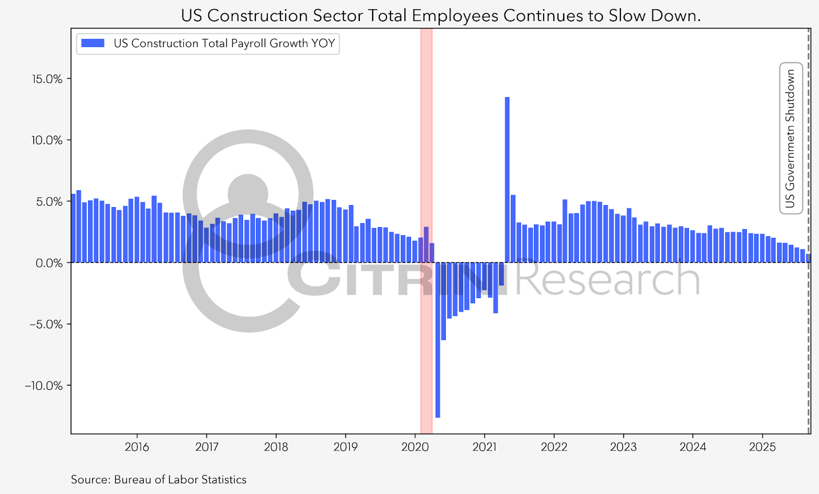 Since our last macro memo, private data sources suggest that the US labor market continues to slow. ADP nonfarm private payroll growth continues to show a steady slowdown, despite month to month noise. When the official NFP job growth stats are released for the month of September on November 20 (apparently the October Jobs Report will be delayed), we expect to see that the ADP numbers are corroborated.