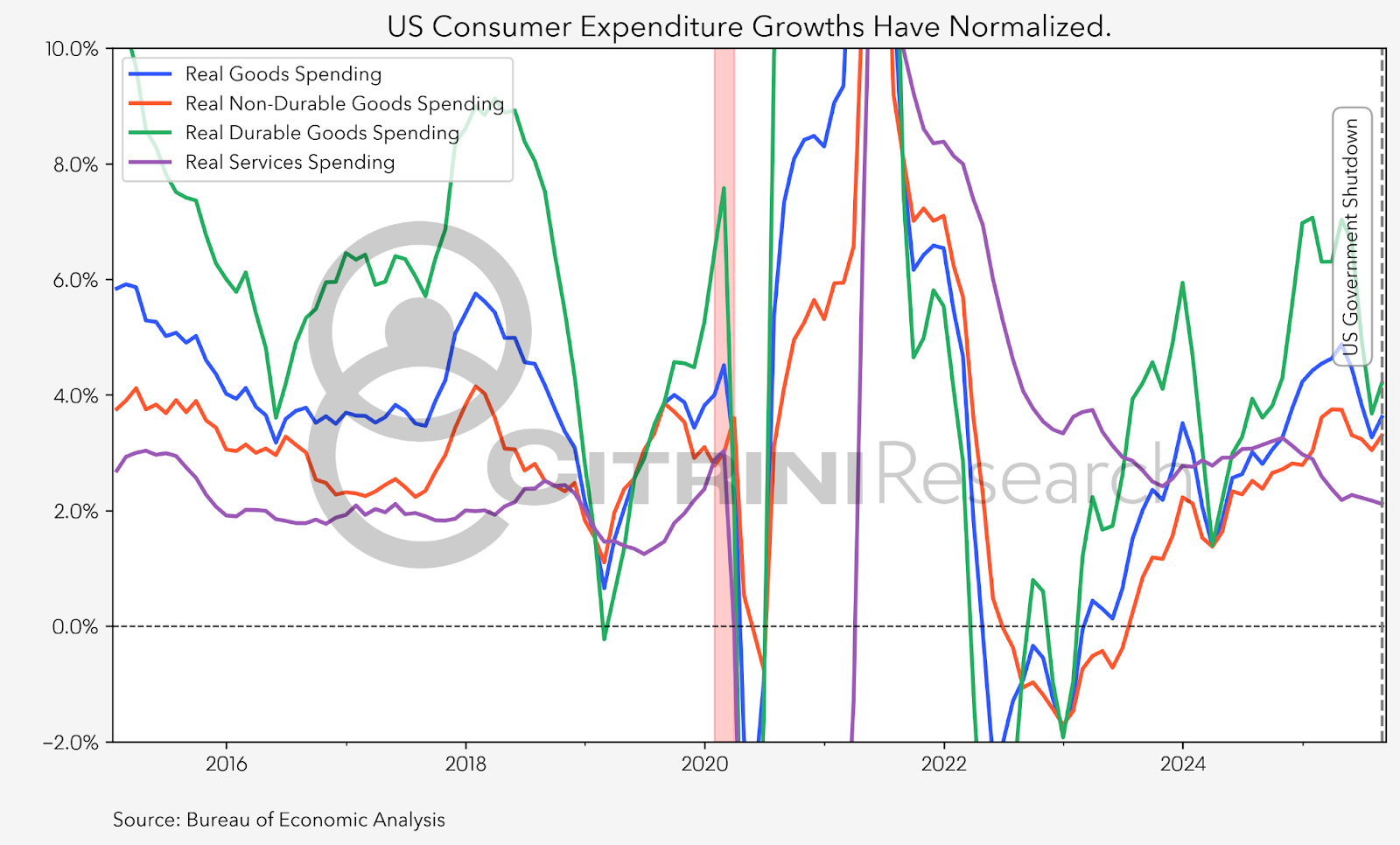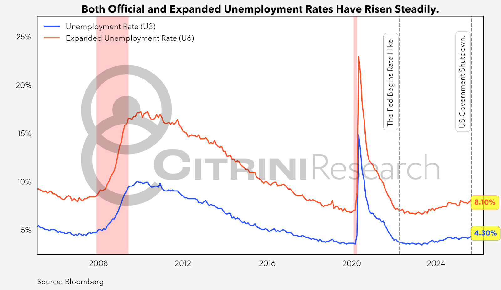 “With the U.S. federal government shut down, last month’s public macroeconomic data are unavailable. Even so, we can still form a reasonable view of overall macro conditions and labor market health. The picture that emerges is one of ‘slowing without breaking’. The U.S. economy remains starkly K-shaped: the wealthy continue to thrive on asset appreciation, while much of the middle and lower income segments face persistent strain.”