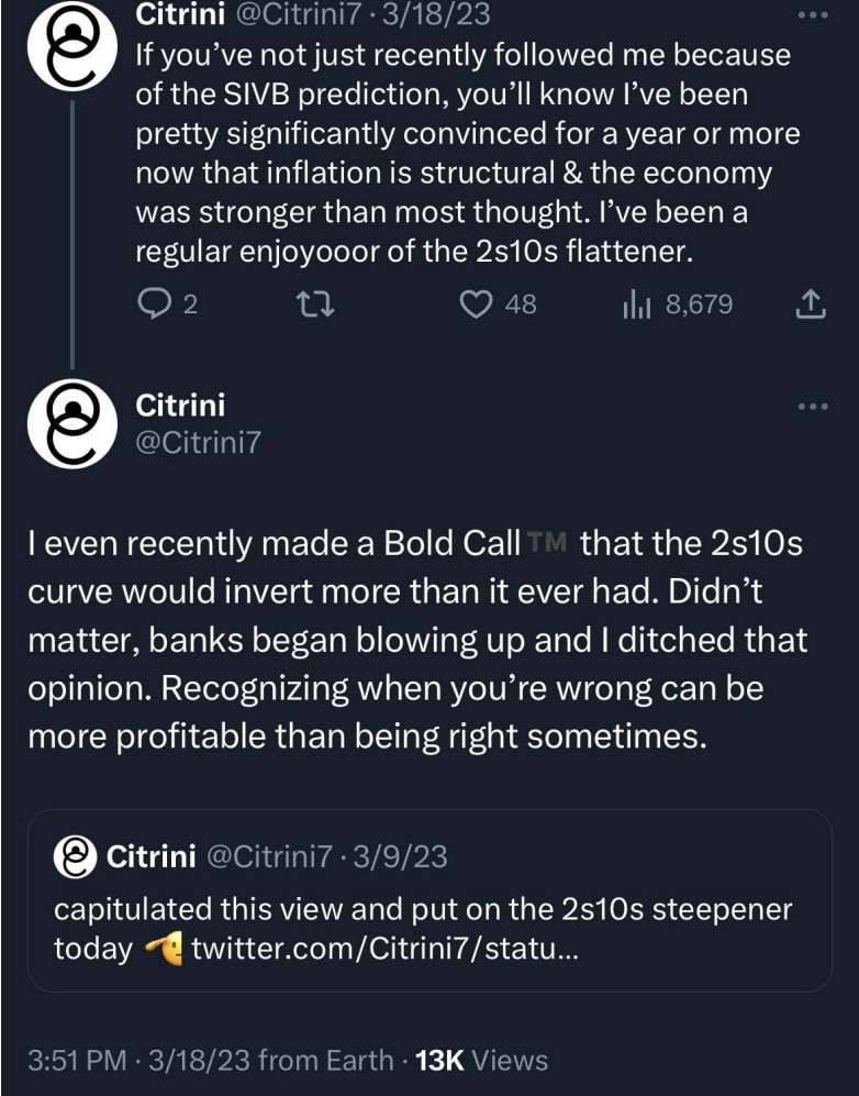 When the risk reward gets too good (or too bad), your thesis should matter less. I explained the thought process behind this when I wrote about putting on the 2s10s steepener in anticipation of a bull steepener as SVB collapsed on March 9th.