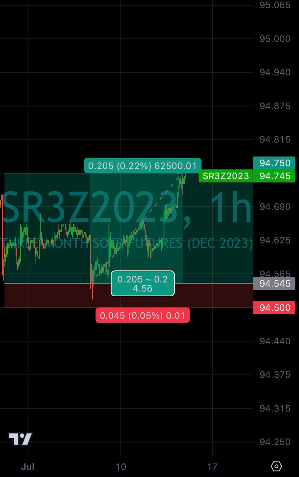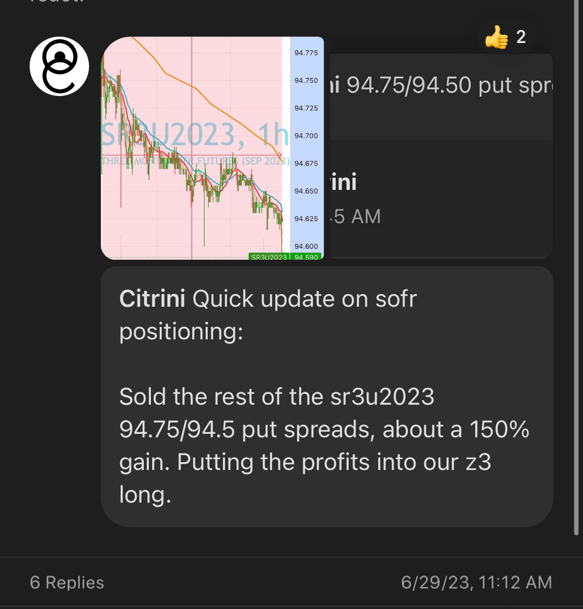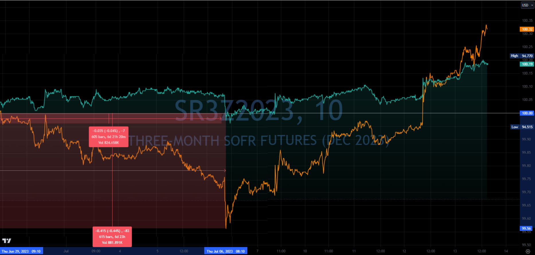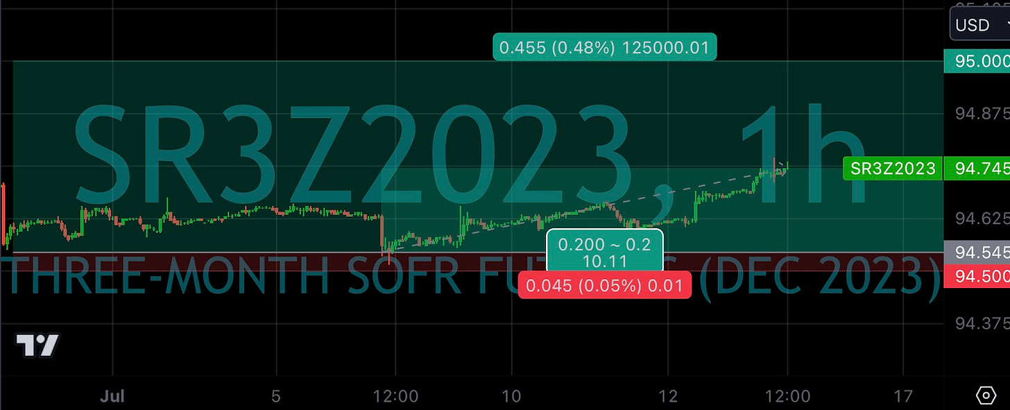 On 6/29, when the entire front end of the curve sold off in spectacular fashion as a response to the ADP jobs report, I booked the profit on the September put spread I had put on and went long Z3 (December 2023 contract) I took profits from having sold 5s on 2s5s10s and a SOFR put spread and put it all into long SFRZ3 futures after the ADP jobs report sent it down to 94.56. I later “averaged down” on this when Fed commentary sent it as low as 94.515, to 94.545 average cost.