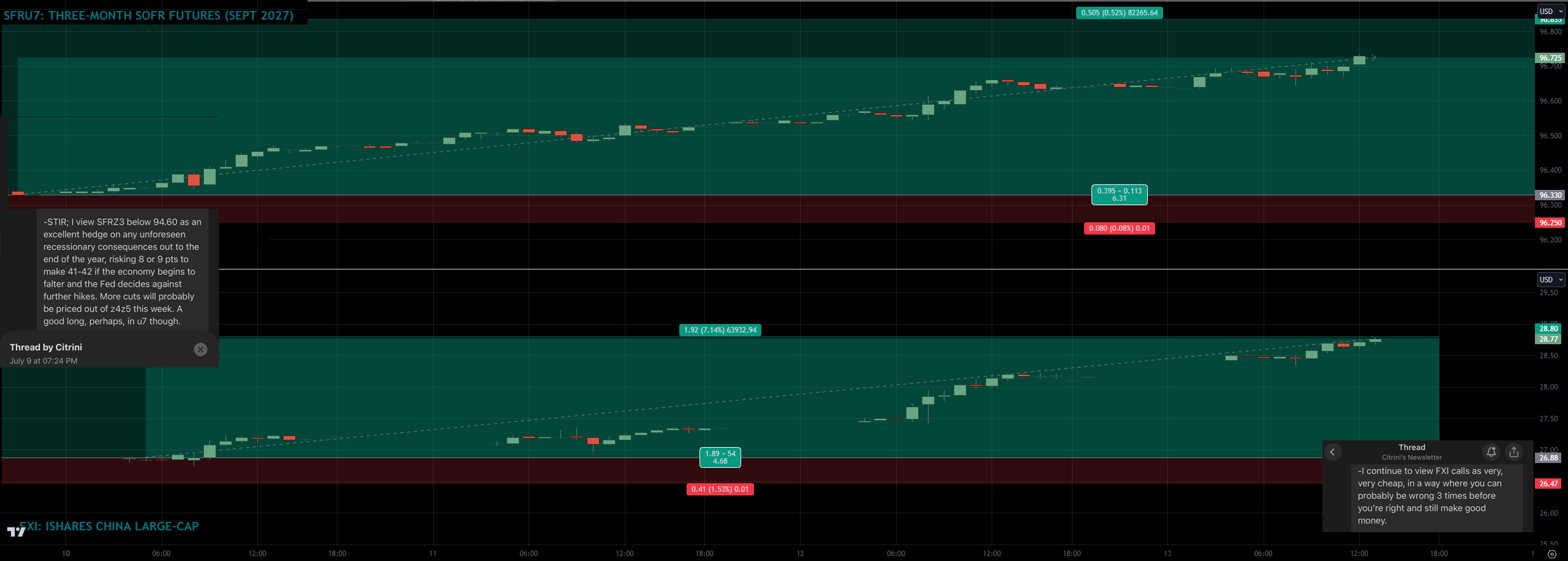 Also, totally unrelated to the discussion of the STIR trade and risk vs. reward but I also said it was the place to go long FXI calls, which is up almost 8% in 4 sessions (the August calls I lifted Friday and Monday are up to 36 from 13 and the larger position in further OTM calls I got at the end of May are finally above water again).
