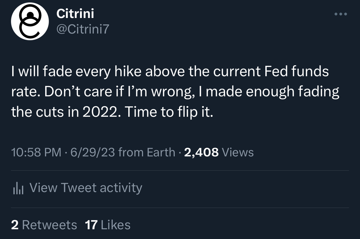 Let’s say I was wrong and this didn’t end up playing out how it did (CPI was hot or Powell was caught ranting at a dead concert about how he’d seen the truth and it was a 10% Fed Funds rate, plenty of scenarios in which I could have been wrong).