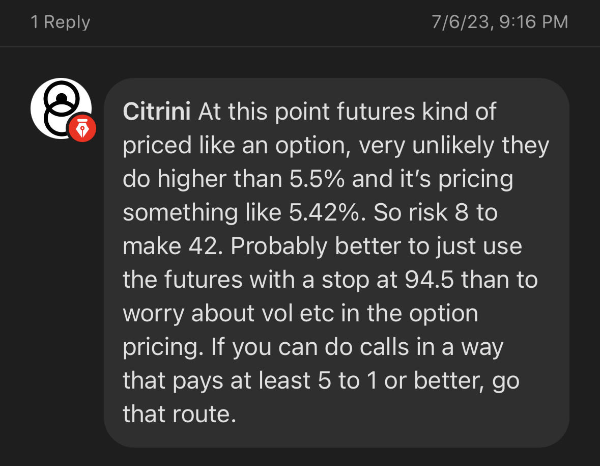 Even if my bull case wasn’t right, my base case that the maximum number of rate hikes left in 2023 was 25bps would have put Z3 at 94.75. 9 ticks of risk to 44 ticks of reward or 4.5x on risk (where it’s trading right now). Not as excellent as 10, but still very good!