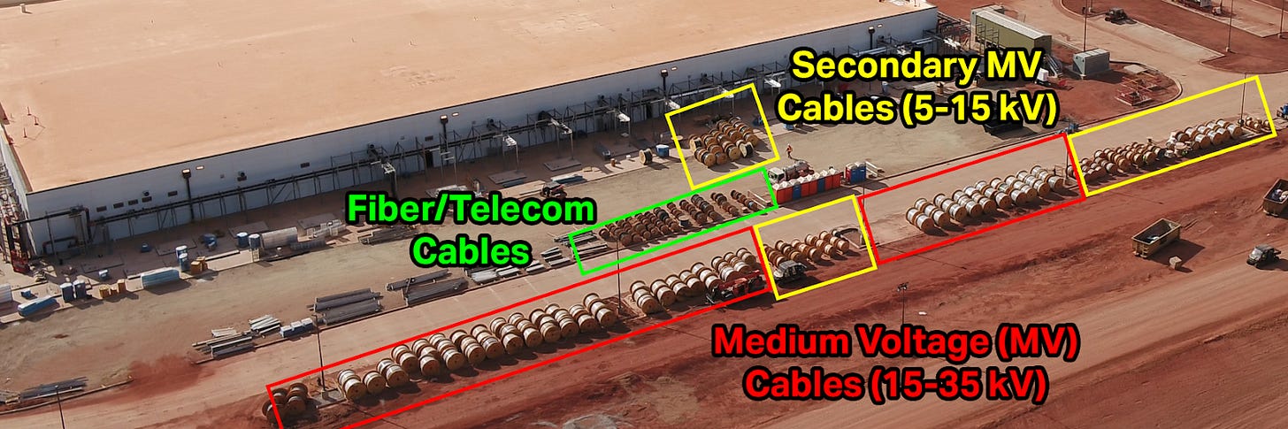 This multiple substation layout will require significant (millions of feet) of medium-voltage cable to distribute power throughout the campus. Prysmian, who acquired Encore Wire back in 2023, has already signed on with a $118M contract to supply this cable.