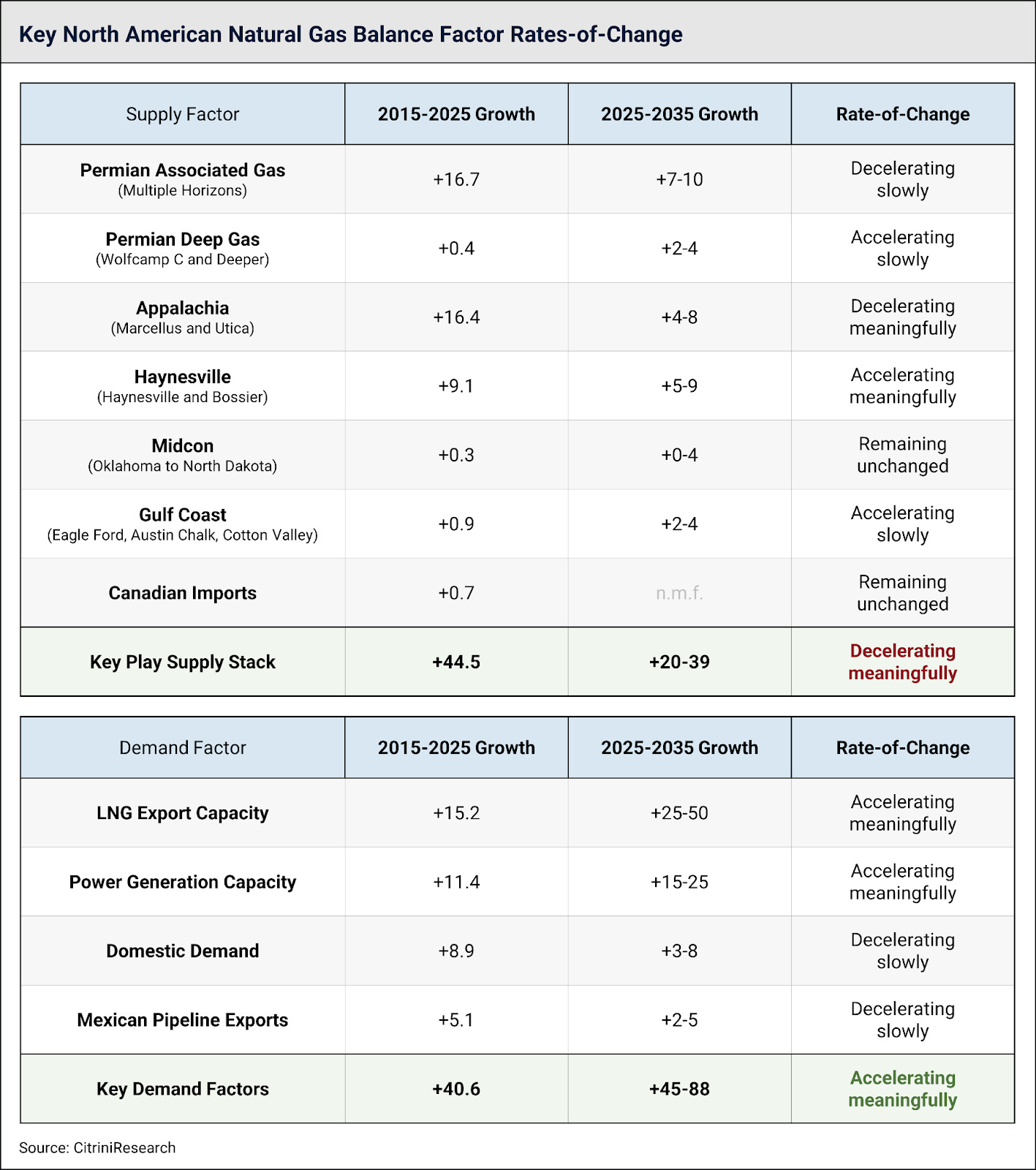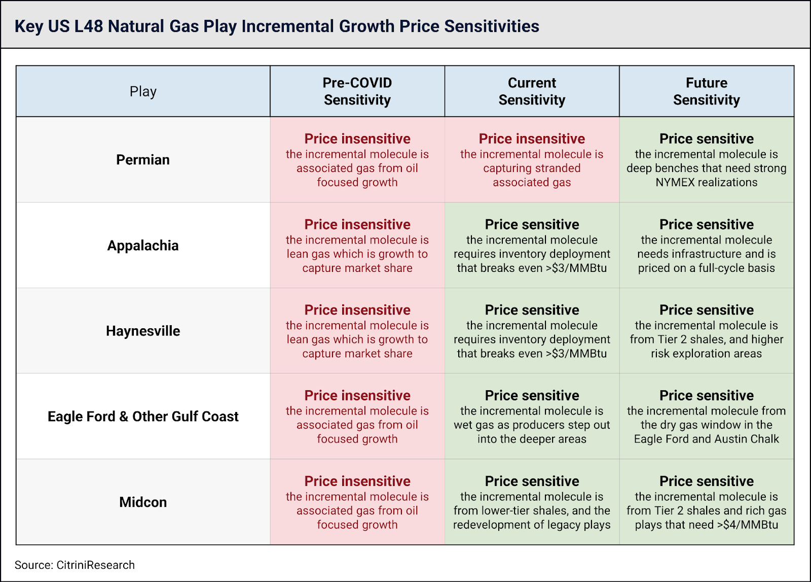 As passive growth from the Permian slows, the natural gas market dynamic shifts to a point where new molecules have to be incentivized to come onto the market. Below we show a table of price sensitivities by play, and through time. The Permian is the last bastion of “free” growth – and this is what the entire market is hanging on to. For context, there’s >30 billion cubic feet per day (Bcf/d) of gas demand lined up to capitalize on just ~10 Bcf/d of “free” Permian gas growth. For context, 30 Bcf/d is ~30% of current US production.