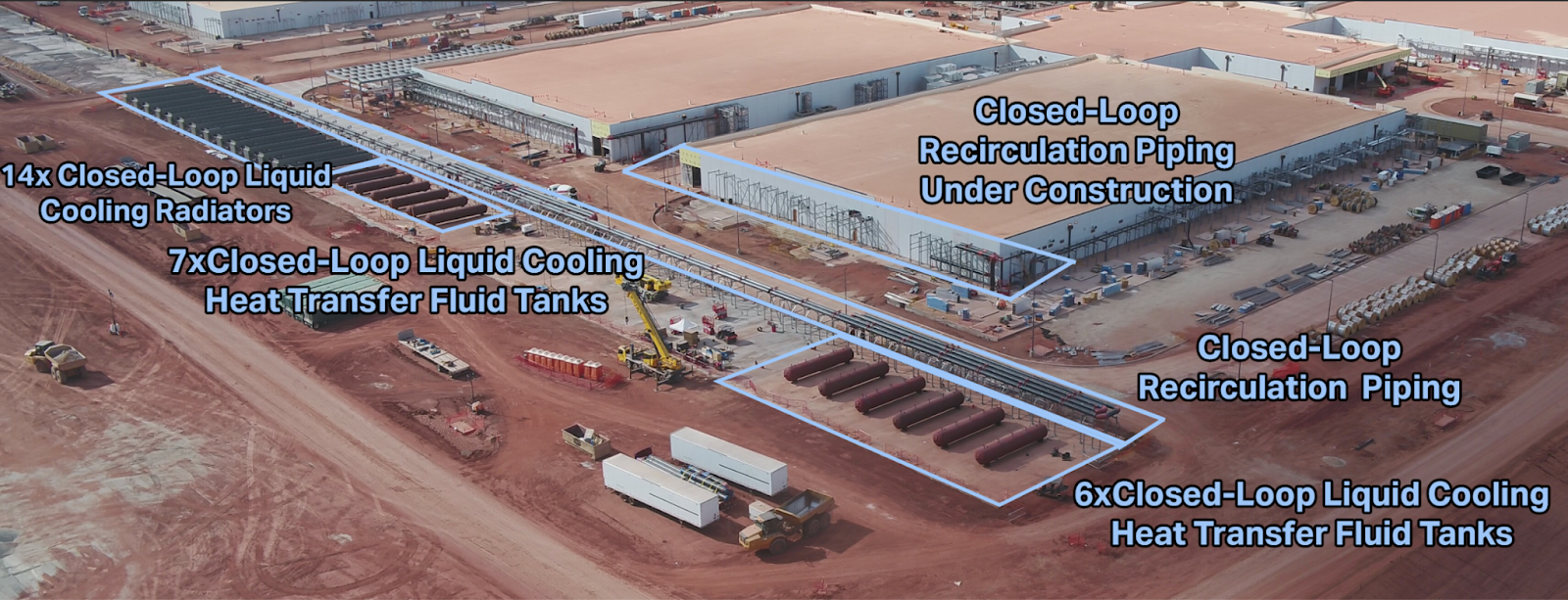 Looking at images from roughly 4 months ago, we can see the trench work for water/glycol distribution to and from the adiabatic/dry fluid cooler D2C loop we see installed today.