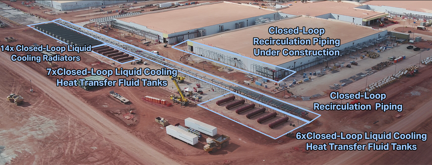 In the images and videos, we see extensive evidence of exactly what it takes to cool the Machine God’s infrastructure: cooling towers/dry coolers, liquid cooling manifolds, pumps, heat exchangers, CRAH/CRAC, water treatment.