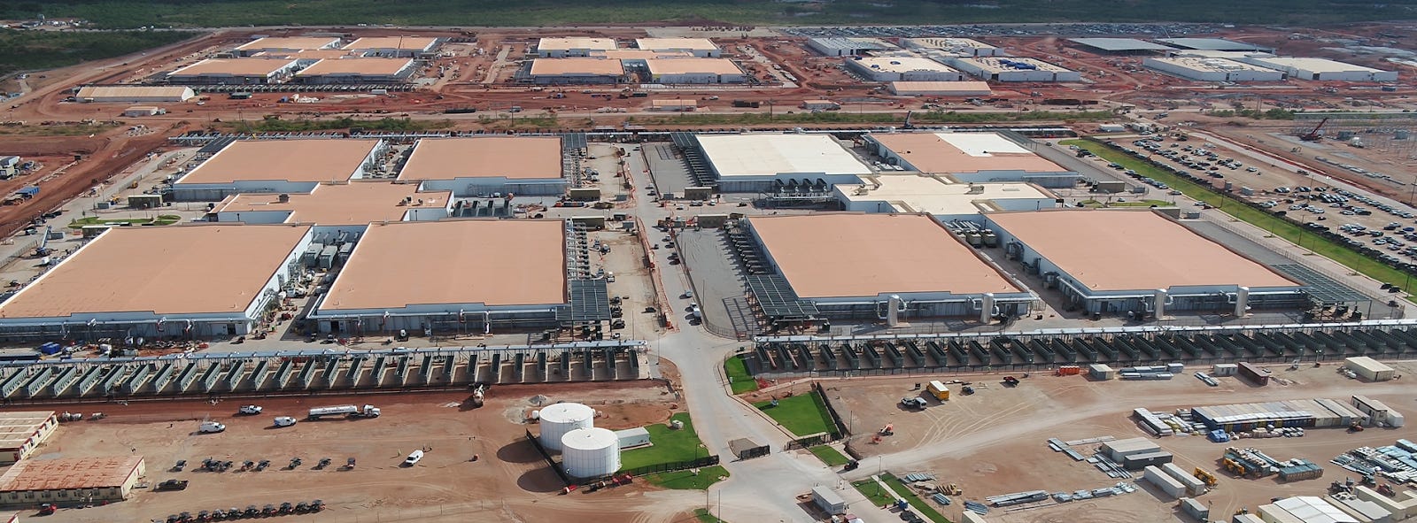 Each building structure is flanked by 39 cooling towers on each side. With eight buildings currently under construction at the site, that equates to 624 enormous HVAC racks, each one dwarfing the size of a school bus. Below we see more of the underlying equipment under these gargantuan cooling arrays currently under construction.