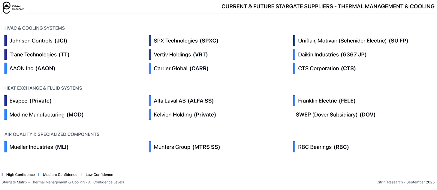 We also see the cooling towers, chillers, tanks and radiators. Companies like SPX Technologies (SPXC), Daikin (6371 JP), SWEP (DOV) are potential suppliers, among many others - see our spreadsheet for more detail.