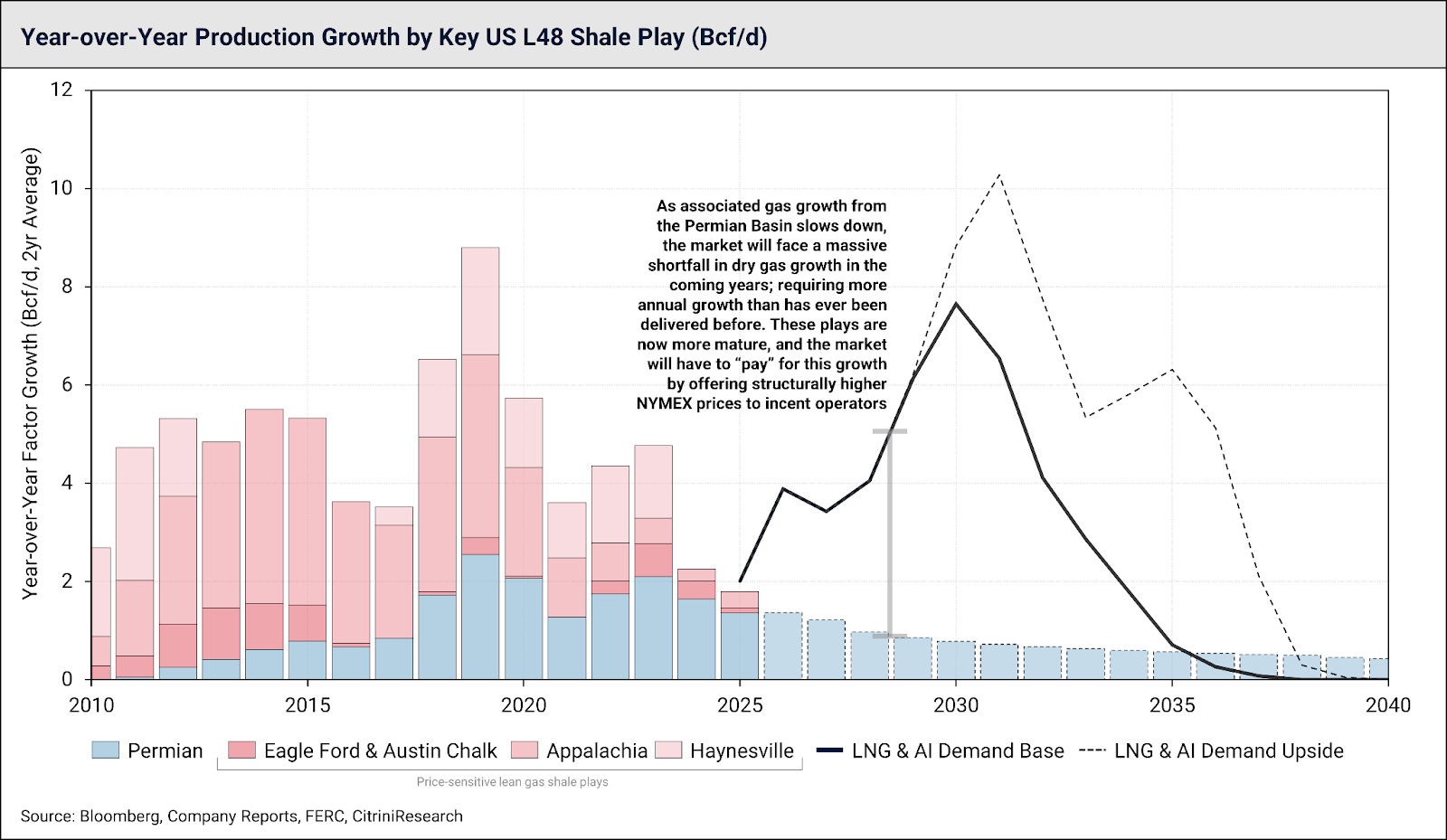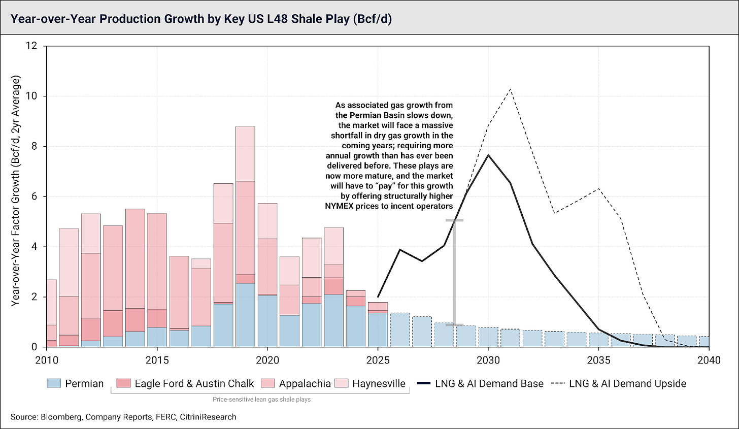 While latent growth from the Permian can answer some of that call, it’s becoming plain-as-day evident we’re going to hit a wall, and run out of cheap gas over the next few years. Below we show historical year-over-year growth from the key US gas plays, and forward demand projections from just LNG export facilities and data centers. We have built these forecasts using gas turbine delivery schedules, and FERC export filings. This gas demand forecast isn’t an estimate, it’s backed by committed infrastructure. What we’ve come to appreciate is that while the world expects the Permian to provide the gas growth to fuel all future projects – the Permian’s associated gas is dangerously “oversubscribed”, and the other dry gas plays will need to fill the gap with record-setting annual growth.