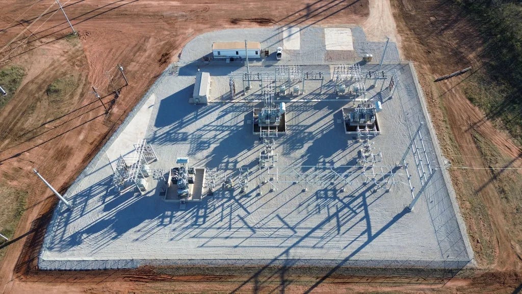 We see high voltage transmission lines, steel lattice transmission towers, switching and transformation equipment, power transformers, busbar systems, lightning arresters and multiple bays for redundancy. Currently, Abilene has a 200MW, 138kV substation that is being expanded by 1GW + 345kV substation with five main power transformers (for a total of 1.2GW).