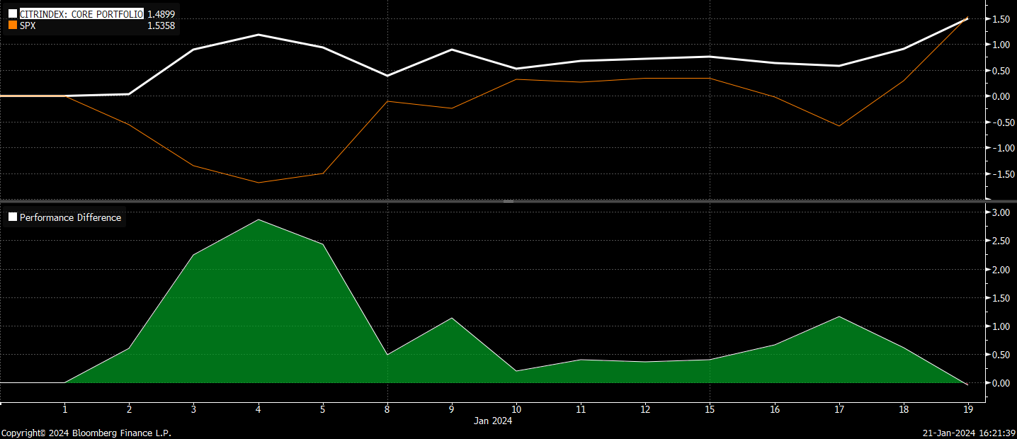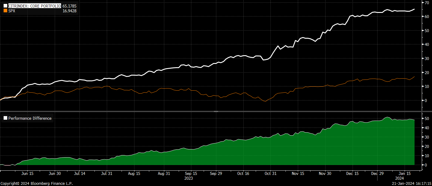 The CitriniResearch core portfolio is up 65.2% since inception, beating the SPX by 48.52%.