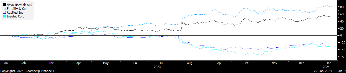 c) Adding back MedTech Shorts: We took off the medtech shorts at the end of october fearing that the move up in rates was exhausted and would reverse violently, which occurred - because of MedTech’s rate sensitivity many of our shorts also rallied, but I have been watching to see when they get extended as our specific medtech names still face significant headwinds from GLP-1 drugs. Additionally, as improved odds for oral increase the chances that supply will be able to meet demand and these second order effects will materialize on a faster time frame, making sell side estimates for penetration look very low.