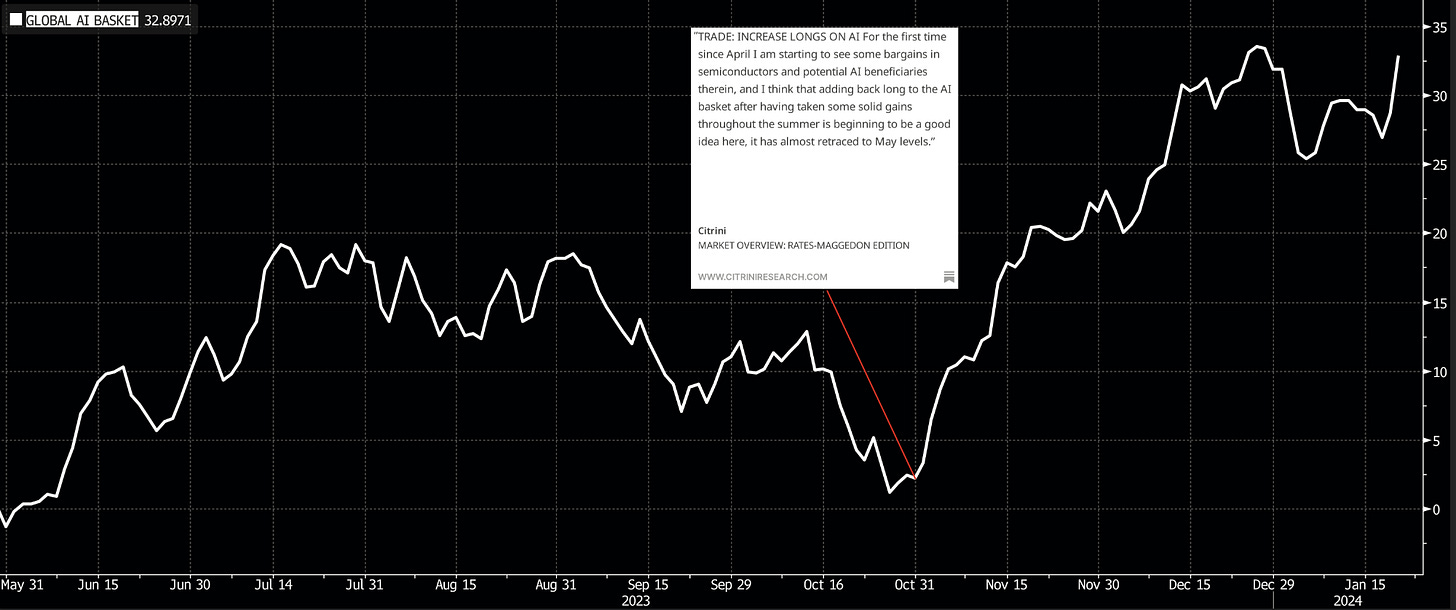 Realize that we began getting long this basket with an average P/E between 18x and 20x, well below the historical mean. The P/E is now 35x. The highest it’s been on this basket since the peak of the ZIRP-Covid Tech Bubble. “AI will change the world” and “It’s time to take some profits on AI” are not mutually exclusive beliefs. There is no cognitive dissonance there.