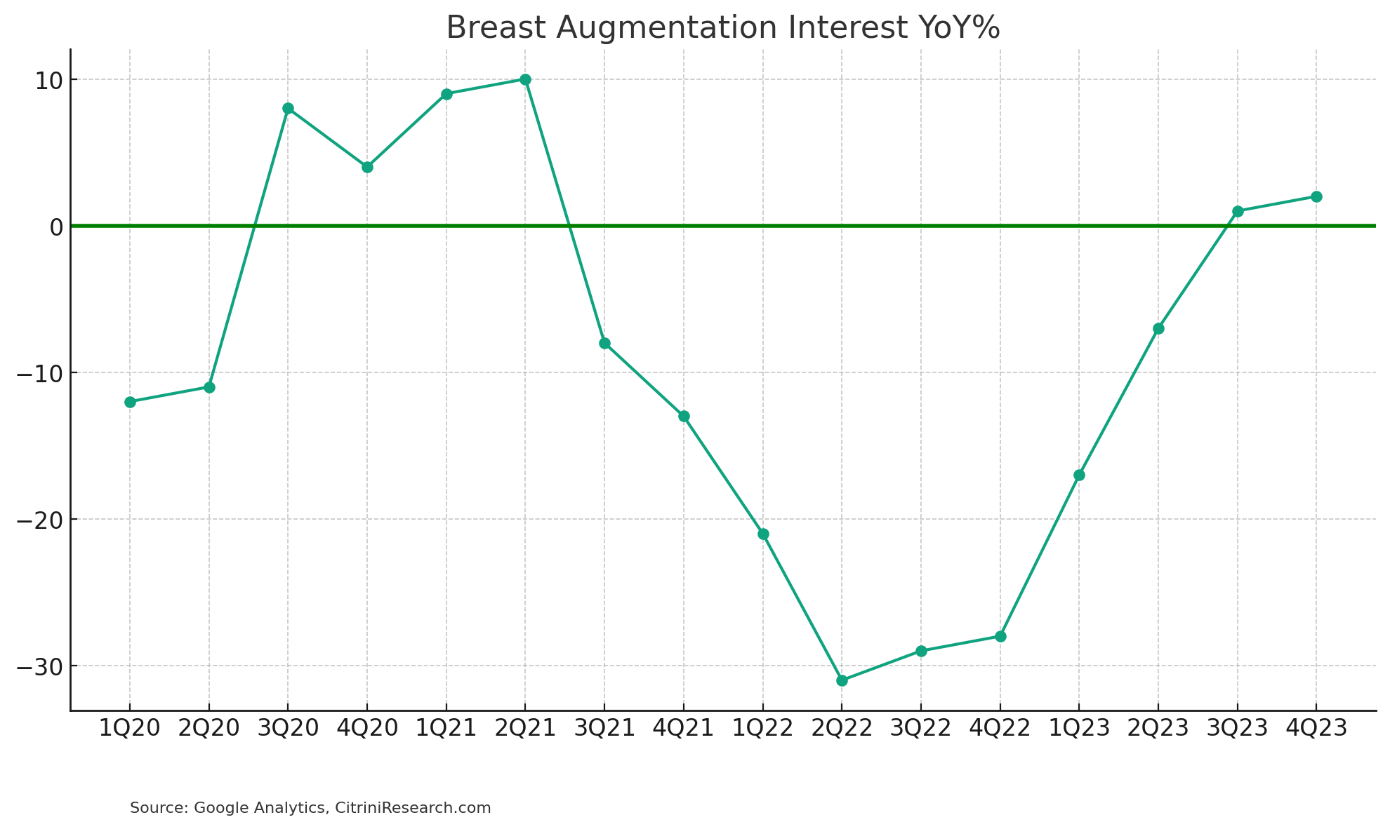 Breast augmentation has turned positive year over year for the first time since 2021 in the last two quarters, perhaps attributable to the wealth effect (I don’t believe this is yet attributable to GLP-1s, although future growth against the easy comps of 1H 23 may be):