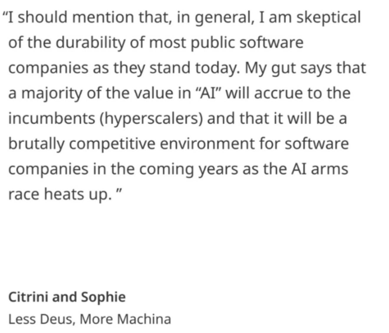 In that scenario, you can be forecasting 500 billion of AI revenue in 2027 and be proven exactly right in 3 years. But, let’s say your expression of that was long NVDA and by the time you’re proven right maybe ASICS have emerged, GPU competition has gotten cutthroat as challengers have scaled, inference has gotten more important than training, parallel computing has gotten commoditized and - in light of all that - NVDA’s 2027 gross margin is going to be 10% and, actually, their market share has gone down. You were right on the broad picture and dead wrong on the second order assumptions because of risks to your priors.