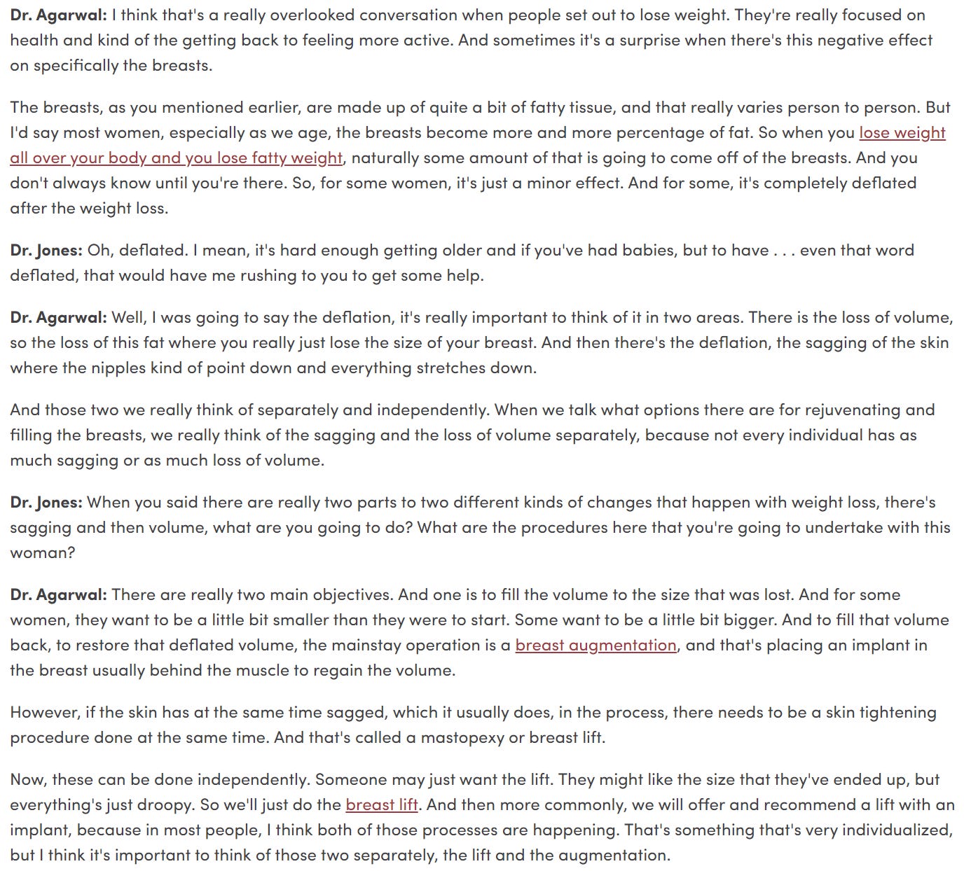 And here’s some more color from Dr. Cori Aggarwal, a cosmetic surgeon who was interviewed on the subject of breast augmentation surgery after weight loss by the University of Utah Health Library: