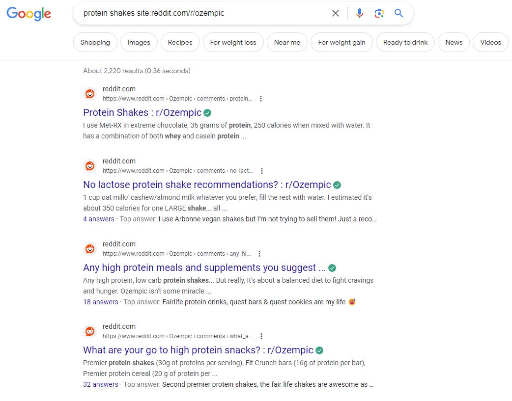 One thing I’ve found interesting in monitoring keyword mentions across the GLP-1 subreddits and facebook groups is increasing mentions of protein supplementation. Primarily interest seems to be in ready-to-drink (RTD) protein shakes: